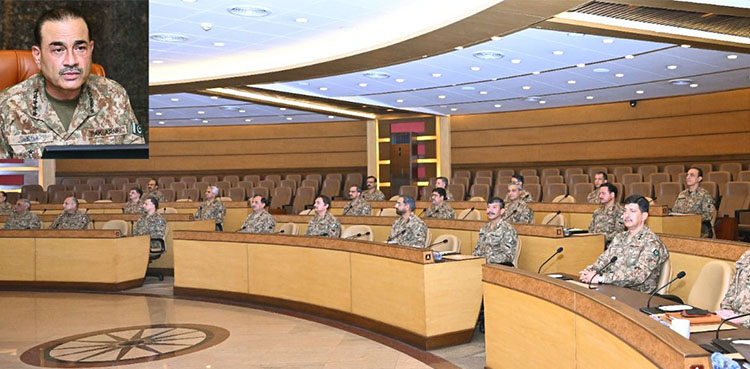 RAWALPINDI: Chief of Army Staff (COAS) Field Marshal Syed Asim Munir, chaired the 272nd Corps Commanders’ Conference at the General Headquarters (GHQ), the Inter-Services Public Relations (ISPR) said in a statement on Wednesday. Accoridng to the military media wing, Field Marshal Syed Asim Munir, NI (M), HJ, Chief of Army Staff (COAS), presided over the 272nd Corps Commanders’ Conference (CCC) held at General Headquarters (GHQ), Rawalpindi. The Forum commenced with Fateha for the martyrs of recent terrorist attacks orchestrated by Indian terror proxies.The COAS Asim Munir commended the spirit, resolve and determination of the Pakistan Armed Forces in war against foreign-sponsored terror proxies and during extensive relief and rescue operations in the aftermath of recent floods, in conjunction with civil administration and other law enforcement agencies.The Forum undertook a comprehensive review of ongoing counter-terrorism operations, emerging threat paradigm and operational readiness. The forum reaffirmed that the Armed Forces remain ready to thwart inimical designs of Pakistan’s adversaries across all domains. The existing nexus between terror and crime with vested political patronage which is gravely hurting the interests of State and security of its people, will not be allowed to continue anymore, come what may.The Forum expressed grave concerns on the recent irresponsible and unwarranted provocative statements by Indian civil and military leadership. Such rhetoric conforms to the well-known Indian propensity of whipping up war hysteria for political benefits. The participants agreed that unwarranted warmongering is likely to lead to heightened tensions and will endanger regional peace and security.The Forum pledged to counter any Indian aggression with a swift and decisive response, shattering any perceived notion of India’s relative safety accruing from geography. Any imaginary new normal will be met with a new normal of swift retributive response.The participants expressed resolve to pursue comprehensive counterterrorism operations across all domains to continue to dismantle the networks of Indian-sponsored terror proxies like Fitna Al-Khawarij and Fitna Al-Hindustan.The participants of the 272nd Corps Commanders’ Conference acknowledged the significance of Pakistan’s recent high-level diplomatic engagements and reaffirmed the commitment to global and regional peace. The Forum welcomed the landmark Strategic Mutual Defence Agreement between Pakistan and the Kingdom of Saudi Arabia, aimed at strengthening strategic relations and enhancing multi-domain cooperation for a joint response to any external aggression. This agreement underscores shared values, mutual respect, and a joint vision for peace and security in the Middle Eastern and South Asian regions.The forum reiterated Pakistan’s uncompromising support for the legitimate struggle of the Kashmiri people for their right to self-determination, as enshrined in relevant UN Security Council resolutions. The Forum also reaffirmed Pakistan’s unwavering support for the Palestinian cause and hoped for early ceasefire and delivery of humanitarian aid to the people of Gaza. The Forum reiterated Pakistan’s principled stance on Palestine issue, voicing support for the two-state solution with an independent Palestinian state, based on pre-1967 borders and Al Quds Al Sharif as its capital.In his closing remarks, the COAS Asim Munir directed the Commanders to ensure the highest standards of operational readiness, discipline, physical fitness, innovation and responsiveness. The COAS expressed full confidence in the operational preparedness of Pakistan Army to counter threats across the entire spectrum, from conventional and sub-conventional, to hybrid and asymmetric threats. Also Read: Field Marshal Asim Munir, Chinese FM discuss regional security
