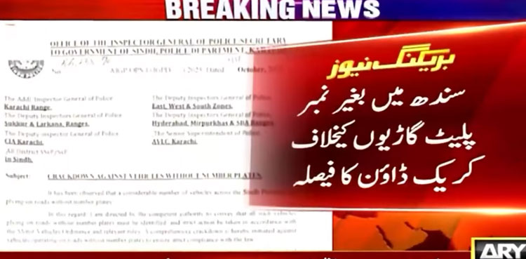 KARACHI: Inspector General (IG) Sindh Ghulam Nabi Memon on Saturday ordered the police to start a crackdown against vehicles without number plates, ARY News reported.The IG Sindh has sent a letter to all high-ups of the Sindh police regarding action against vehicles lacking number plates. He has penned letters to the additional IG Karachi, all DIGs and SPs of the province for action against the vehicles without number plates.Ghulam Nabi Memon ordered the police to launch a crackdown for the strict implementation of the law. He also instructed them to take strict action under the motor vehicle ordinance against such lawbreakers.Ghulam Nabi Memon directed that he be given a daily report on registered cases and arrests of these violators.https://youtu.be/hFt5pridSwM?si=1QhkIeOOGxxy1J5SEarlier, it was reported that vehicles without number plates were roaming freely on Karachi roads, and no action had been taken against them. Netizens have shared videos of such vehicles running on the roads without displaying number plates.The IG Sindh has taken notice of such stories while e-challans are being conducted under the modern system.Earlier in the previous month of October, Karachi traffic police introduced an electronic challan (e-challan) system, under which any traffic violation across the city will be immediately recorded and fined through CCTV cameras.Speaking at a seminar held at a private hotel in Karachi, IG Sindh emphasized that citizens must comply with traffic laws, while DIG Traffic noted that the system would also help reduce road accidents.However, several city stakeholders raised concerns about the initiative, questioning how challans could be issued when Karachi’s infrastructure itself remains in a deteriorated state.Police officials further highlighted that the driving licence system has also been improved, with over 300,000 citizens obtaining online licences, aimed at strengthening overall traffic management.Authorities urged the public to follow traffic rules not only to avoid fines but also to prevent accidents and ensure safer roads.Automated challans will then be issued and delivered to the violator’s home via post. Citizens of Karachi will also be able to access their challan details through the official traffic police mobile app.The Karachi traffic police has urged citizens to follow traffic laws strictly in order to avoid penalties and unnecessary hassle.